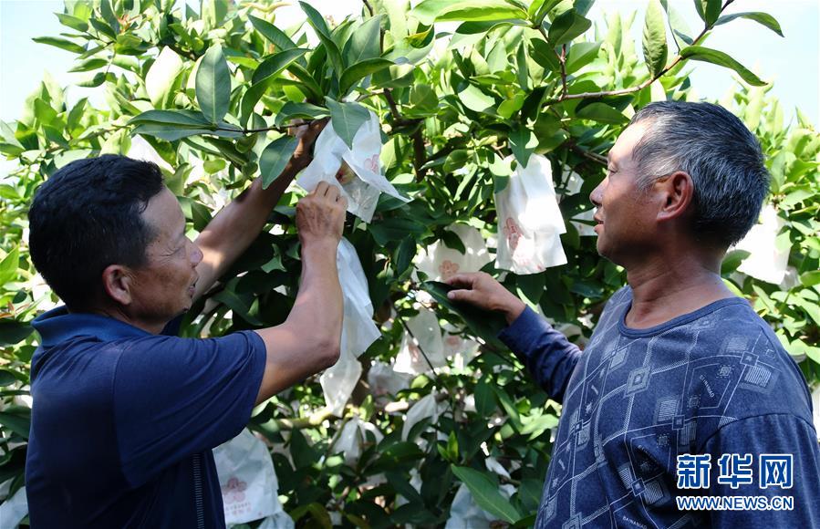 6月18日,在漳州市东山县前楼镇叶厝村的精准扶贫基地莲雾果园里,詹锦成(右)向叶厝村前村委会主任、种养大户叶员发请教莲雾种植技术。贫困户詹锦成通过种植水果,已于2017年脱贫。