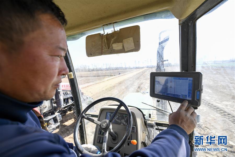在位于宁夏吴忠市利通区金积镇塔湾村的智慧农业科技示范区,农机手在播种前调试自动驾驶拖拉机(2020年4月9日摄)。新华社记者 冯开华 摄