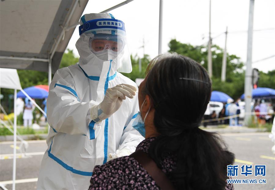 6月15日,在位于北京市丰台区新村街道的一处临时核酸采样点,工作人员进行咽拭子采样。 新华社记者 任超 摄