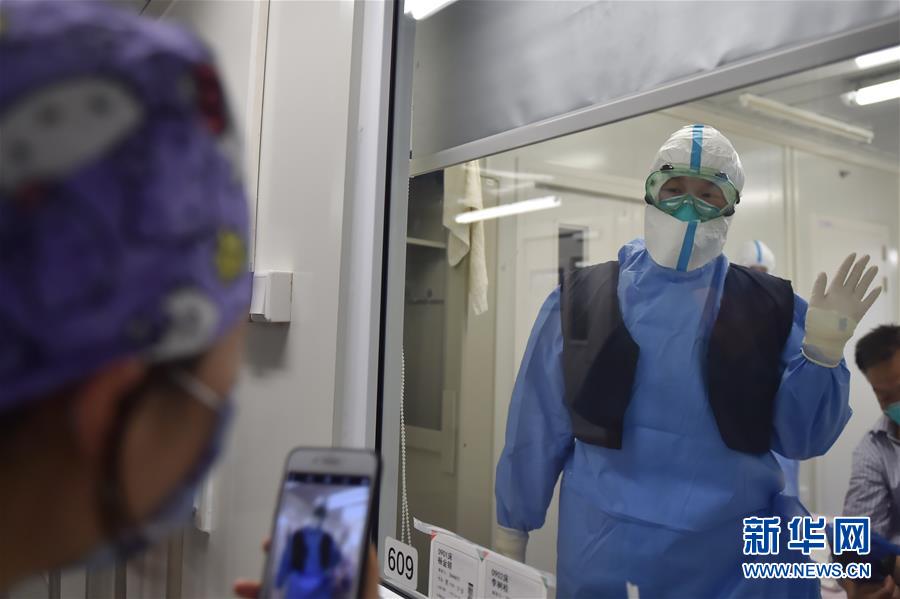 6月19日,在北京地坛医院隔离病房内,护士穿上同事送来的降温马甲后,向同事打招呼感谢。 新华社记者 彭子洋 摄