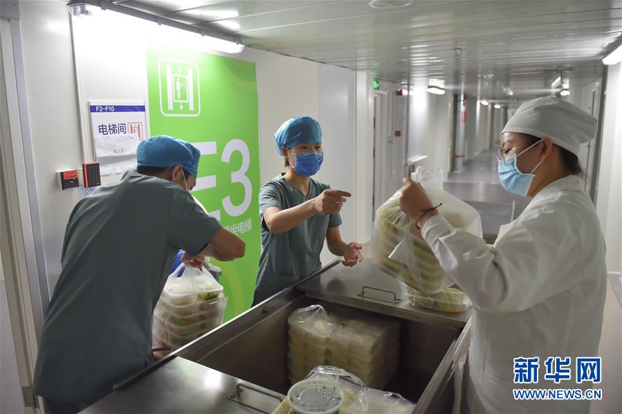 6月19日,在北京地坛医院隔离病区外,护士为病人取餐。 新华社记者 彭子洋 摄
