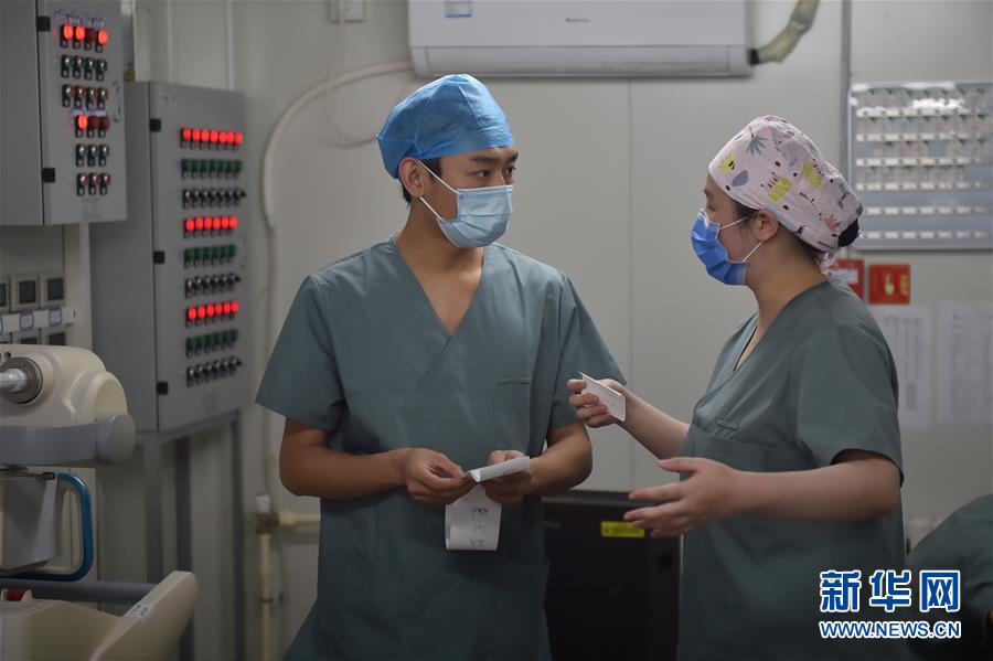 6月19日,在北京地坛医院隔离病区护士站,白班护士(右)和夜班护士在做交接。 新华社记者 彭子洋 摄