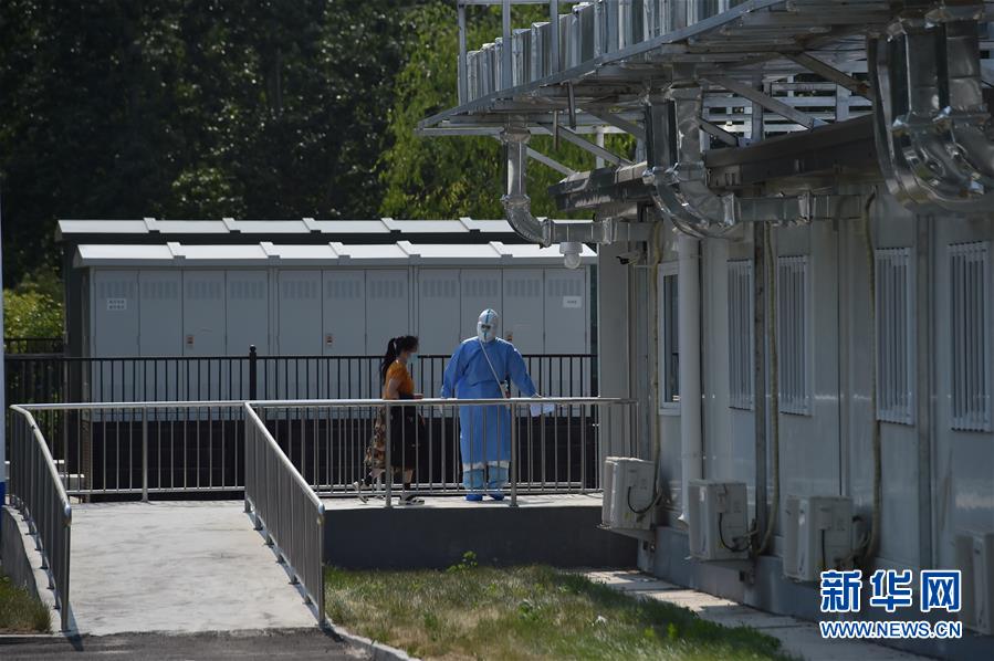 6月19日,在北京地坛医院隔离病区外,一名新收治的病人(左)准备进入隔离病区。 新华社记者 彭子洋 摄