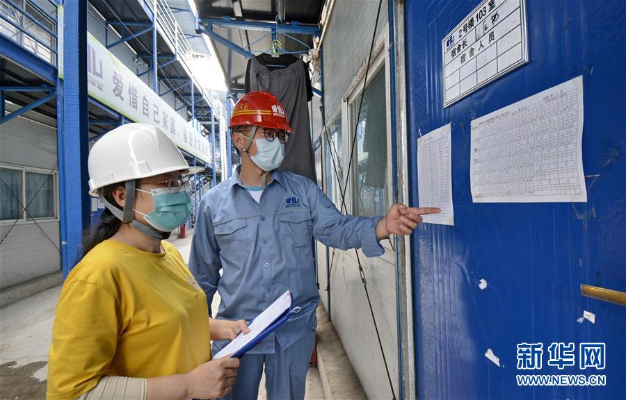 6月23日,丰台区宛平城地区办事处工作人员在一处保障房建筑工地巡查宿舍防疫消毒。 近日,北京市丰台区宛平城地区办事处对辖区内的施工工地、园林绿化、城市保洁等务工人员的工作环境实施每日巡查,强化工作环境、居住环境、餐饮环境的消毒和防疫力度,保障外来务工人员工作生活安全。 新华社记者 李欣 摄
