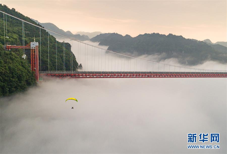 6月26日,在湖南省吉首市,游客乘坐动力伞在矮寨特大悬索桥附近飞翔。 当日是端午小长假的第二天,人们外出休闲,亲近自然,欢度假期。 新华社发(张术杰 摄)