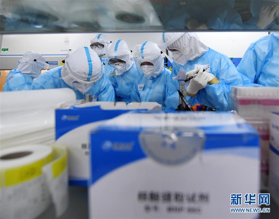 检测人员在实验室做处理样本前的准备工作(6月25日摄)。 从98家检测机构、日检测能力4万多份,到128家机构、480个采样场所、2422个采样点位、日检测能力超30万份,面对突如其来的新发地农产品批发市场聚集性疫情,短短10多天时间,北京市不断提升核酸检测能力、扩大检测范围。近日,记者来到北京金域医学检验实验室,用镜头记录深夜实验室里的战“疫”身影。 新华社记者 张晨霖 摄