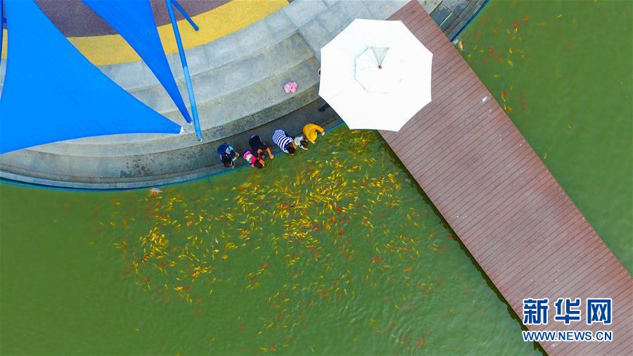6月26日,游客在河北唐山曹妃甸湿地公园赏鱼(无人机照片)。 据文化和旅游部公布的端午小长假旅游统计数据,6月25至27日,全国累计接待国内游客4880.9万人次,累计实现国内旅游收入122.8亿元。 新华社发(赵海涛 摄)