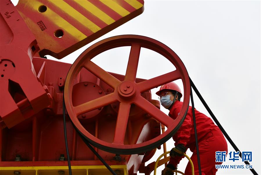 6月29日,冯萌萌在大港油田采油二厂二区内检查机器皮带磨损情况。新华社记者 李然 摄