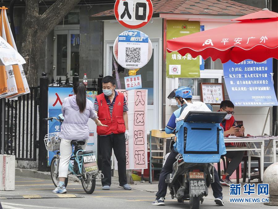王保山(左二)在北京市西城区广外街道小马厂东社区入口为居民测量体温(6月17日摄)。58岁的王保山党龄35年,是西城区委老干部局工作人员,也是一名下沉干部。疫情发生后,北京市大批党员干部下沉到社区防控一线,与社区工作人员一起进行人员排查、隔离管理、核酸检测、社区服务等工作。 新华社记者 张玉薇 摄