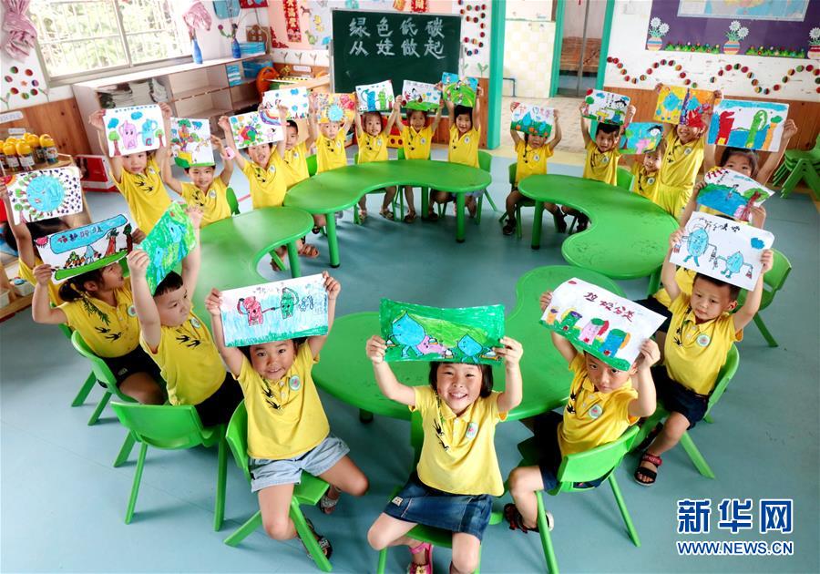 7月2日,湖南省涟源市桥头河镇新培童心幼儿园的小朋友展示手绘的低碳环保作品。 当日是第8个全国低碳日,主题是“绿色低碳、全面小康”。各地开展形式多样的主题活动,倡导低碳环保的绿色生活方式。 新华社发(张扬摄)