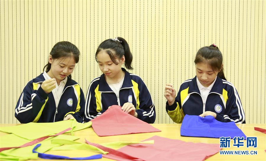 7月2日,河北省广宗县第一中学学生手工缝制环保手提袋。 当日是第8个全国低碳日,主题是“绿色低碳、全面小康”。各地开展形式多样的主题活动,倡导低碳环保的绿色生活方式。 新华社发(张驰摄)