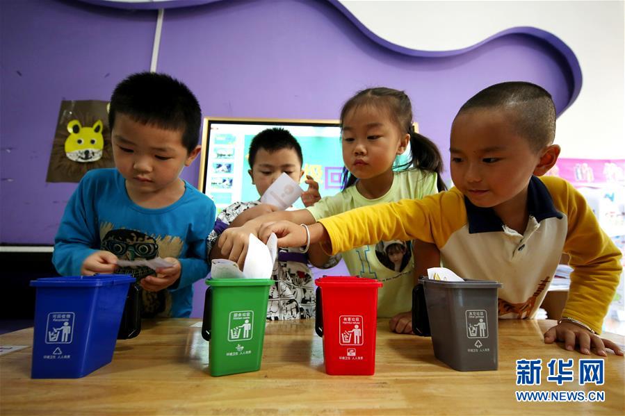 7月2日,在贵州省丹寨县第三幼儿园,小朋友学习垃圾分类投放。 当日是第8个全国低碳日,主题是“绿色低碳、全面小康”。各地开展形式多样的主题活动,倡导低碳环保的绿色生活方式。 新华社发(黄晓海摄)