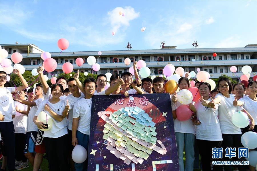 7月4日,湖南省永州市蓝山县第二中学的高三学生展示心愿墙。 2020年全国高考即将拉开帷幕,同学们从容应对,以良好的状态迎接高考的到来。 新华社发(梁利 摄)