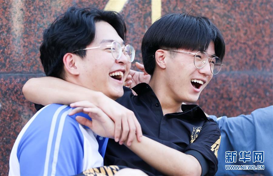7月8日,在吉林省长春市第八中学考点门口,考生庆祝高考结束。 当日,全国部分地区2020年高考结束。 新华社发(颜麟蕴摄)