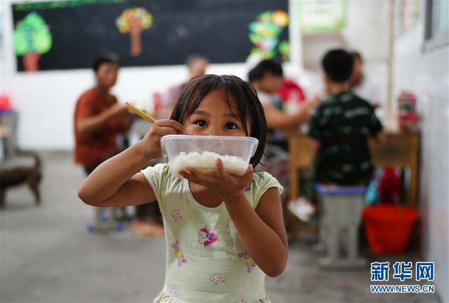 7月9日,小朋友在安置点里吃饭。 当日,江西鄱阳县鄱阳镇因洪水受灾的村民被转移到多个集中安置点。在鄱阳县五一中心学校安置点,志愿者和工作人员接到任务后不到十小时内,为被转移村民布置了28间教室,供519人安顿,并为村民发放褥子、床单、枕头、盒饭、饮用水等物资。 新华社记者 周密 摄