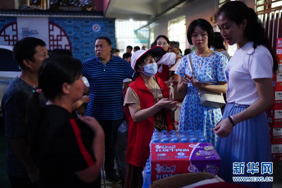 7月9日,志愿者和工作人员为村民分配物资。 当日,江西鄱阳县鄱阳镇因洪水受灾的村民被转移到多个集中安置点。在鄱阳县五一中心学校安置点,志愿者和工作人员接到任务后不到十小时内,为被转移村民布置了28间教室,供519人安顿,并为村民发放褥子、床单、枕头、盒饭、饮用水等物资。 新华社记者 周密 摄