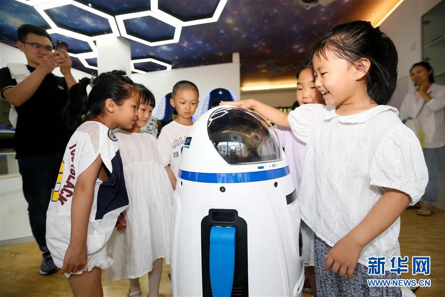 7月12日,小学生在山东省青岛市即墨区环秀街道滨湖社区科普馆与机器人互动。新华社发(梁孝鹏 摄)