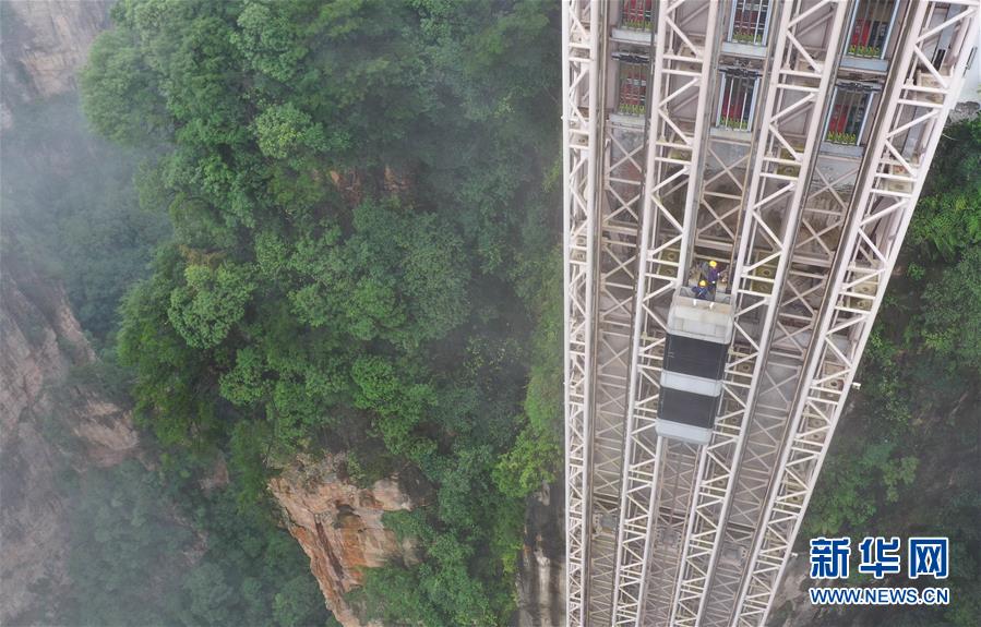 7月13日,湖南张家界市武陵源区百龙天梯工作人员在悬崖钢井架上巡检(无人机照片)。 针对今年夏季降雨量大、持续时间长的情况,张家界市武陵源区组织各景区旅游企业在完善应急保障机制的基础上,加大对载人旅游设施的检查力度,确保汛期游览安全。 新华社发(吴勇兵 摄)