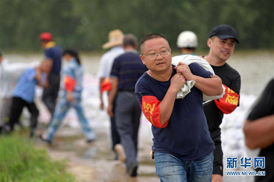 7月13日,在江西省九江市柴桑区江新洲的防洪大堤上,41岁的吴锦梁在搬运沙袋。 吴锦梁是江新洲上蔡洲村人,家安在了九江市区,此次看到了《致江洲在外乡亲的一封信》后立即返乡参与防汛工作。 新华社记者 彭昭之 摄