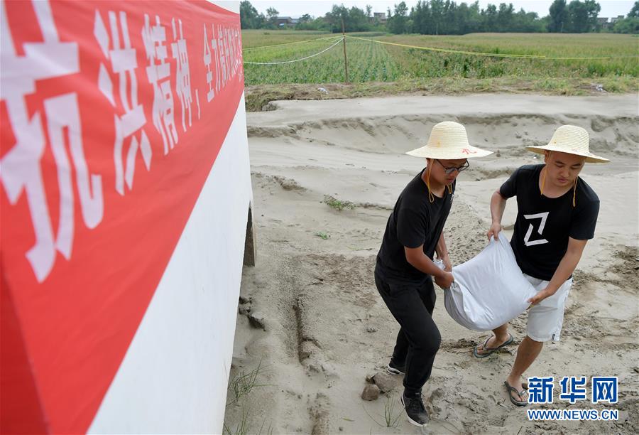 7月13日,在江西省九江市柴桑区江新洲的126防汛哨所,张洋(右)和黄傲一起搬运刚装好的沙袋。 他们俩从小到大都是同学,目前都在九江市区工作,自从返乡参与防汛后,就被分配到了126防汛哨所,平时负责装填、搬运沙袋,巡查大堤等工作。新华社记者 彭昭之 摄