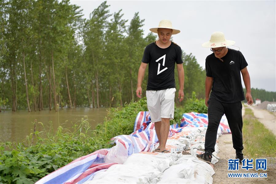 7月13日,在江西省九江市柴桑区江新洲的126防汛哨所,张洋(左)和黄傲一起巡查堤坝,踩实没有压紧的沙袋。 他们俩从小到大都是同学,目前都在九江市区工作,自从返乡参与防汛后,就被分配到了126防汛哨所,平时负责装填、搬运沙袋,巡查大堤等工作。新华社记者 彭昭之 摄