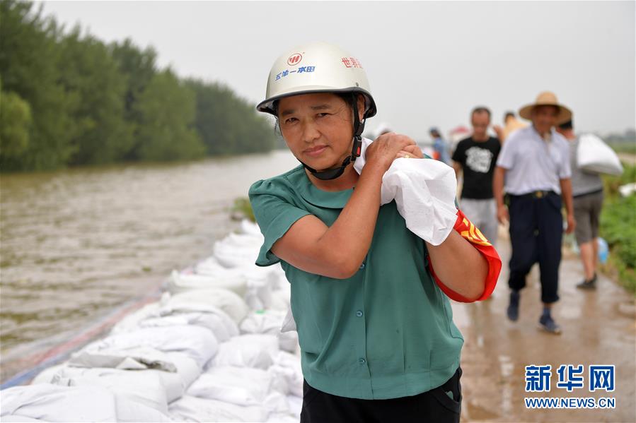 7月13日,在江西省九江市柴桑区江新洲的防洪大堤上,55岁的周香枝在搬运沙袋。 她是江新洲上蔡洲村人,在外务工多年,在九江市区安了家,此次是专门返乡参与防汛工作。 新华社记者 彭昭之 摄