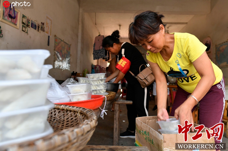 2020年7月14日上午,在位于江西省鄱阳县鄱阳镇朱家桥村至江家岭村的昌江圩堤外,浑浊的昌江水几乎与加固加高的圩堤持平,多名救援人员顶着烈日正在填装沙袋,加固昌江圩堤。堤下的朱家桥村,一支“奶奶”们自发组织起来的服务队,为官兵们做起了米饺,煮上了绿豆汤。大家齐动手包米饺。图片来源:王祺/IC photo