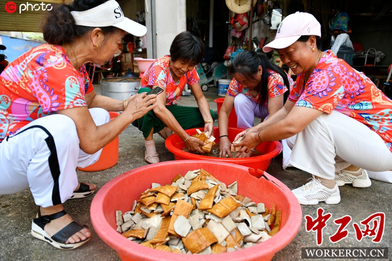 2020年7月14日上午,在位于江西省鄱阳县鄱阳镇朱家桥村至江家岭村的昌江圩堤外,浑浊的昌江水几乎与加固加高的圩堤持平,多名救援人员顶着烈日正在填装沙袋,加固昌江圩堤。堤下的朱家桥村,一支“奶奶”们自发组织起来的服务队,为官兵们做起了米饺,煮上了绿豆汤。采买完成后,回到村里开始准备米饺馅。服务队有十多个成员,最大的66岁,大都已经有了孙辈。图片来源:王祺/IC photo