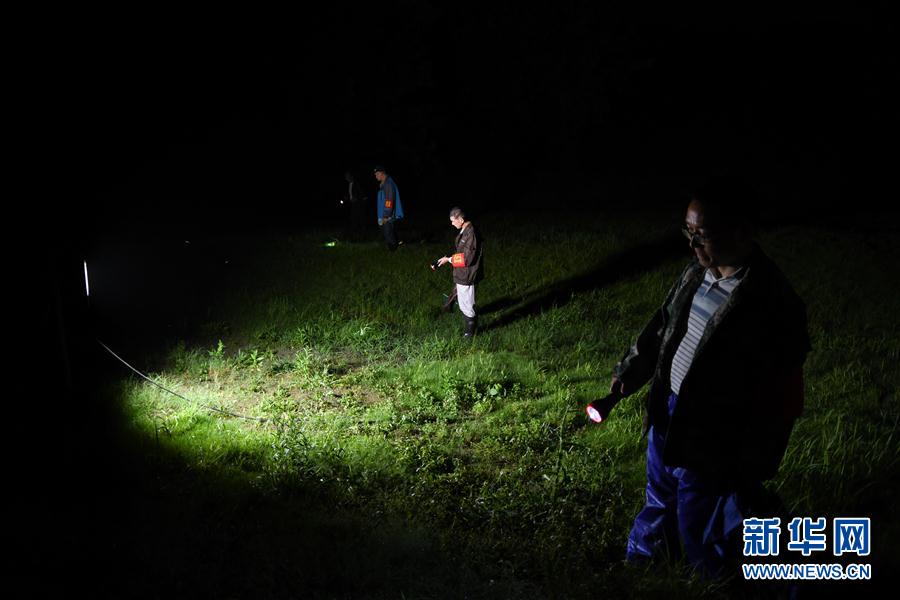 7月15日晚,安徽省芜湖市弋江区马塘街道防汛人员在青弋江大堤巡查。 新华社记者 张端 摄