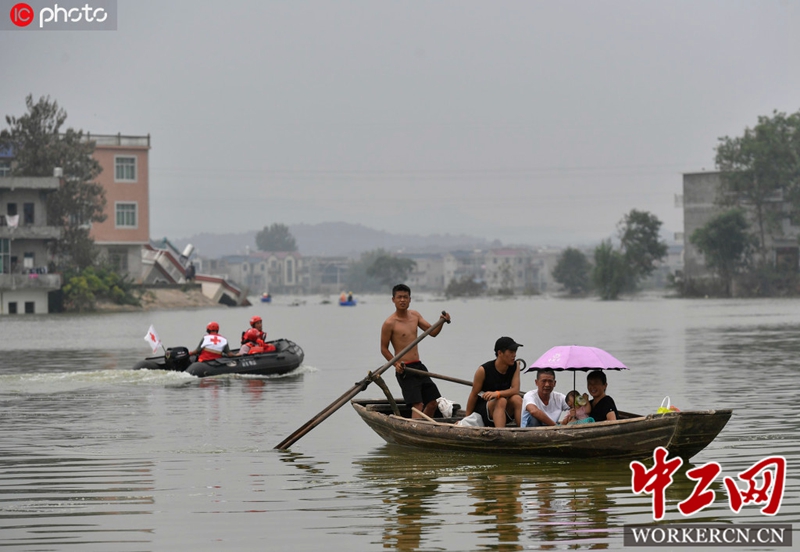 2020年7月15日,江西省鄱阳县油墩街镇同兴村,村庄受到洪水围困,大部分村民已经被转移出去,仍有少数村民选择留守家中积极自救继续生活。图片来源:王祺/IC photo