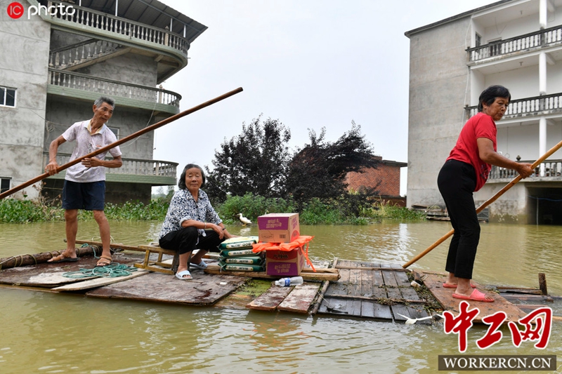 2020年7月15日,同兴村村民张长来夫妇带着刚刚领到的大米、方便面、饮用水乘船回到家中。图片来源:王祺/IC photo