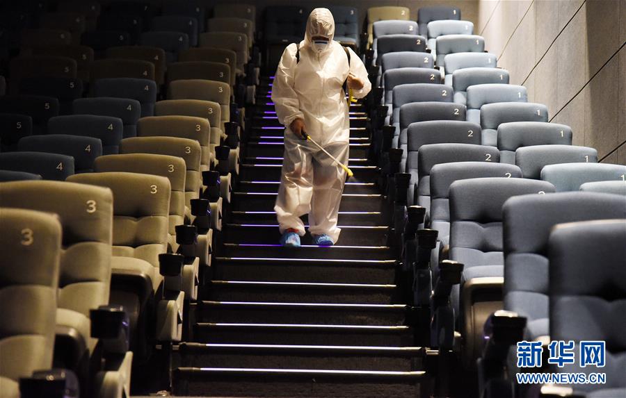 7月19日,河北省邯郸市丛台区一家影院的工作人员对放映厅进行消毒,为恢复开放营业做准备。 国家电影局7月16日下发通知规定,低风险地区在电影院各项防控措施有效落实到位的前提下,可于7月20日有序恢复开放营业。 新华社发(郝群英 摄)