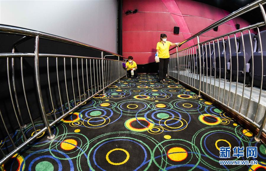 7月19日,河北唐山遵化市一家电影院的工作人员对放映厅扶手进行擦拭消毒,为恢复开放营业做准备。 国家电影局7月16日下发通知规定,低风险地区在电影院各项防控措施有效落实到位的前提下,可于7月20日有序恢复开放营业。 新华社发(刘满仓 摄)