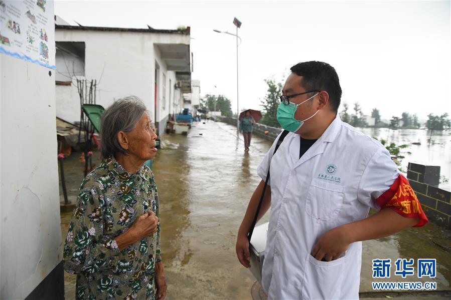 7月21日,在蒙洼蓄洪区内的解放庄台,阜南县人民医院赵少飞医生(右)为村民提供健康咨询。 7月20日,淮河王家坝闸开闸泄洪,蒙洼蓄洪区启用,蓄洪区内的庄台被洪水包围。7月21日,安徽省阜南县人民医院派出由20名医护人员组成的医疗服务队驻守王家坝镇的19个庄台,为当地百姓提供医疗服务。 新华社记者 张端 摄