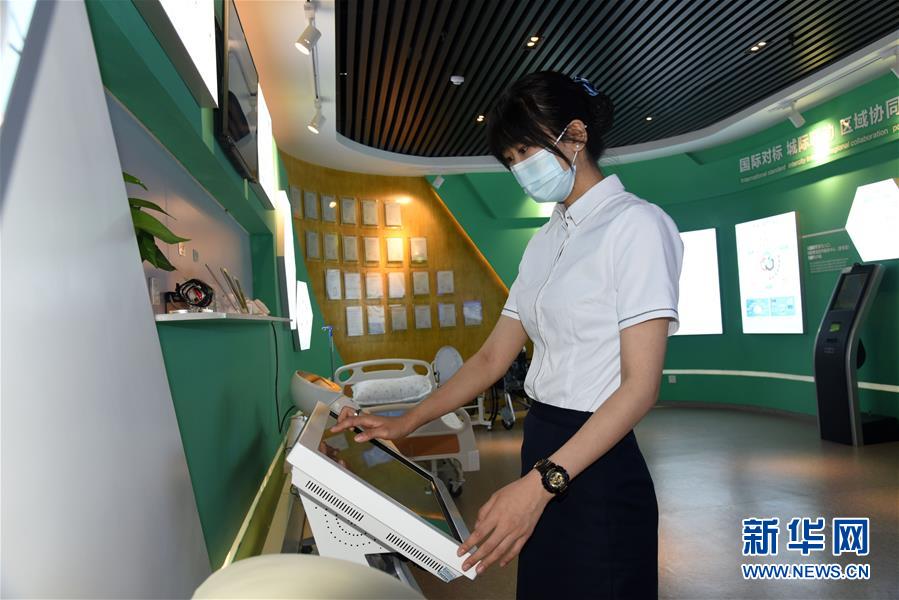 7月22日,青岛瑞源中康颐养护理院的工作人员演示智慧化医养结合器械。 近年来,山东省青岛市坚持智慧化医养结合的服务标准,打造集养老、医疗、平台、培训为一体的养老服务,重点围绕机构、社区及居家三个维度,构建起物联网智慧医养结合养老服务生态圈。 新华社记者 王凯 摄
