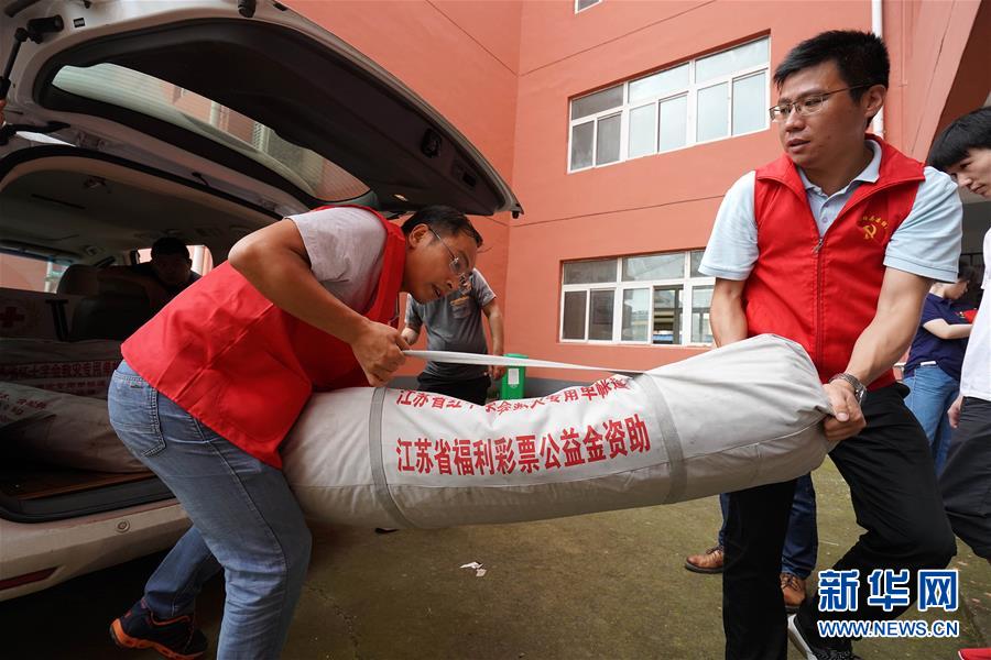 7月23日,工作人员在盱眙县鲍集小学安置点搬运帐篷。 当日,受淮河盱眙段水位上涨影响,江苏省淮安市盱眙县启动鲍集圩行洪区万余名群众撤离转移工作,确保安全度汛。 新华社记者 韩瑜庆 摄