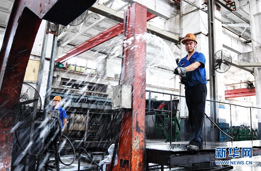 7月24日,中国铁路南昌局集团有限公司福州机务段的检修工对机车检修库房进行洒水降温。 夏日炎炎,劳动者们不畏高温酷暑,坚守岗位,辛勤付出。 新华社记者 林善传 摄