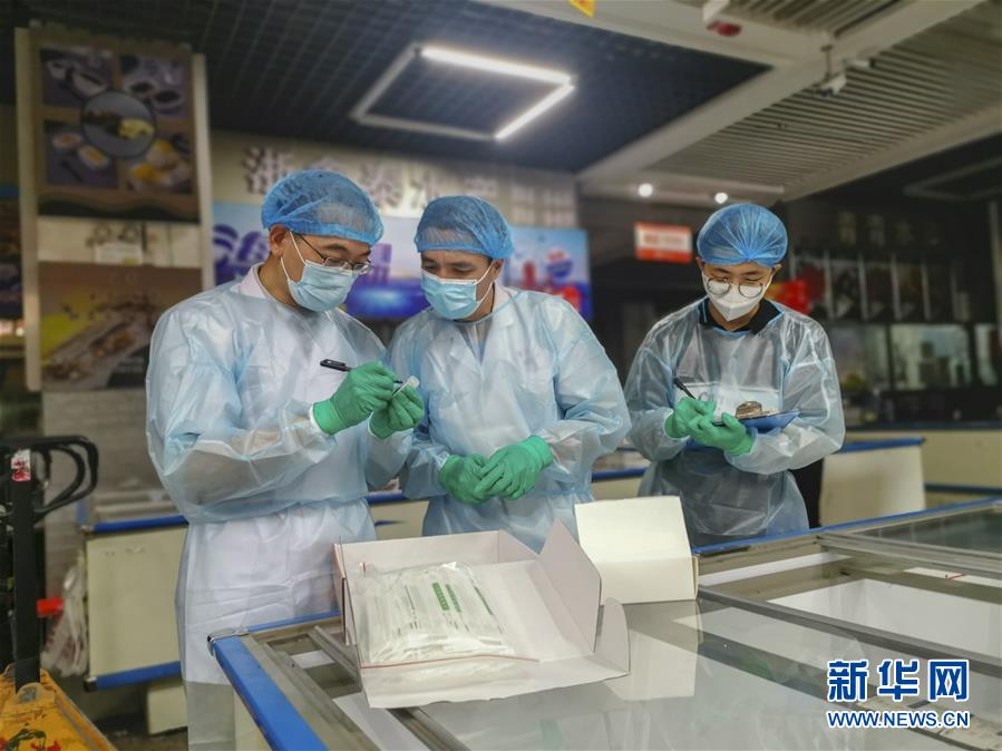乌鲁木齐市疾控中心工作人员对乌鲁木齐一家海鲜市场外环境进行采样(7月25日手机拍摄)。 新华社发(宋宁 摄)