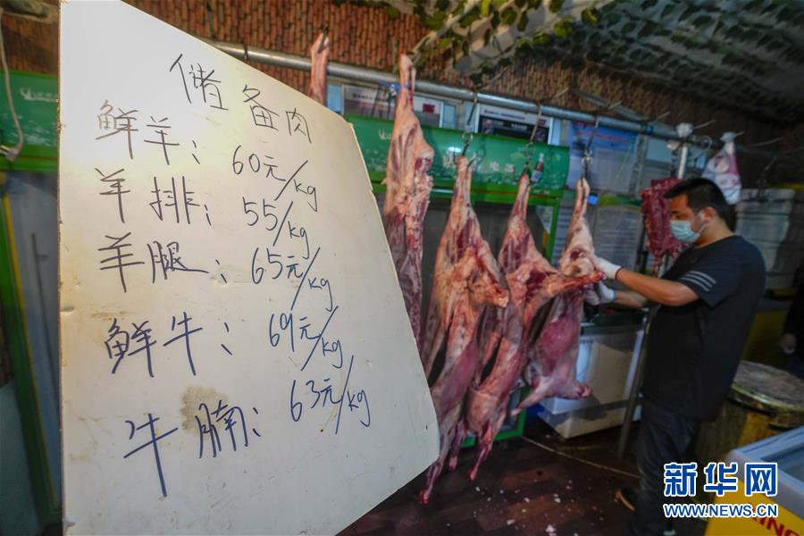 7月30日,在乌鲁木齐经济技术开发区(头屯河区)天鹅湖社区牛羊肉直销点,商贩在分割新鲜羊肉。 新华社记者 赵戈 摄