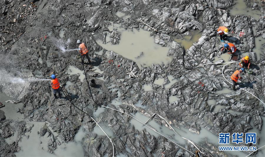 8月3日,工人在黄金峡水利枢纽电站基坑进行岩面清理。 盛夏时节,在秦岭深处的黄金峡水利枢纽工地上,施工人员冒着酷暑加班加点奋战,以确保今年11月进行右岸二期截流。黄金峡水利枢纽坝址位于汉江干流上游峡谷段,是引汉济渭工程的重要组成部分。 新华社记者 陶明 摄