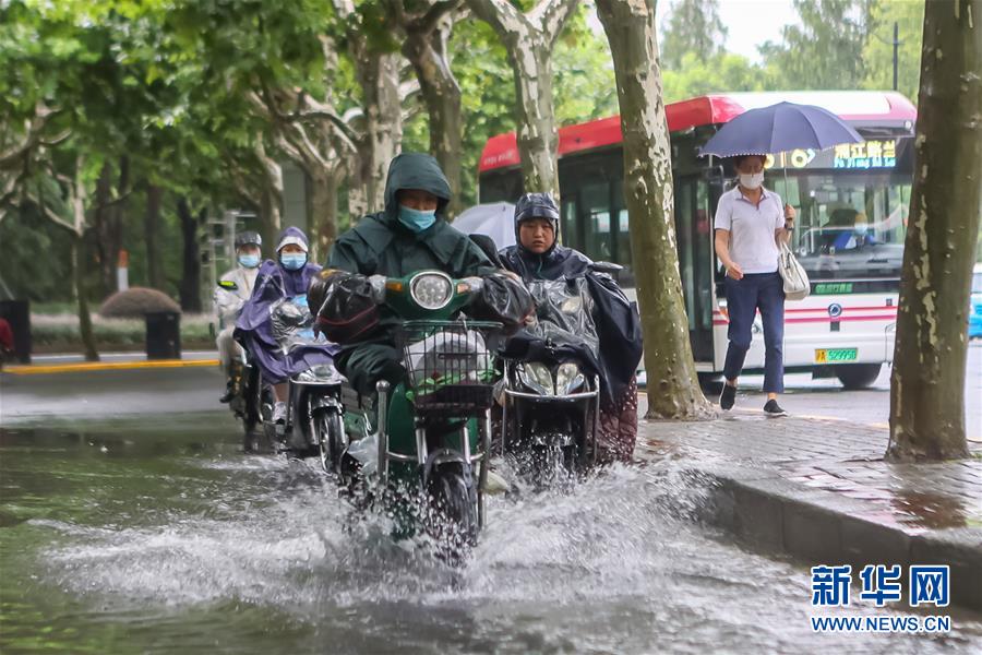 8月5日,在上海市,人们骑行经过一段积水路面。