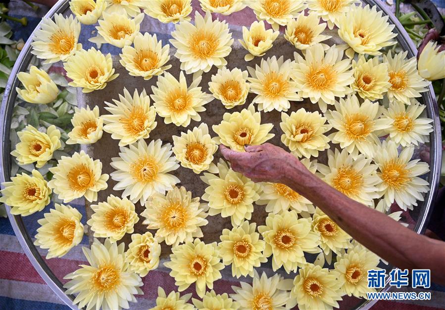 8月5日,在广西柳州市柳北区石碑坪镇下陶村,村民对刚采摘的九品香水莲花进行修剪。 近日,柳州市柳北区石碑坪镇下陶村种植的九品香水莲花进入丰产期,村民忙采摘、加工莲花。近年来,为了提升经济效益,柳北区石碑坪镇将水田进行资源整合,打造九品香水莲花种植基地,并对花朵进行加工,制成莲花茶,提升了经济效益,成为农民脱贫致富的新途径。 新华社发(黎寒池 摄)