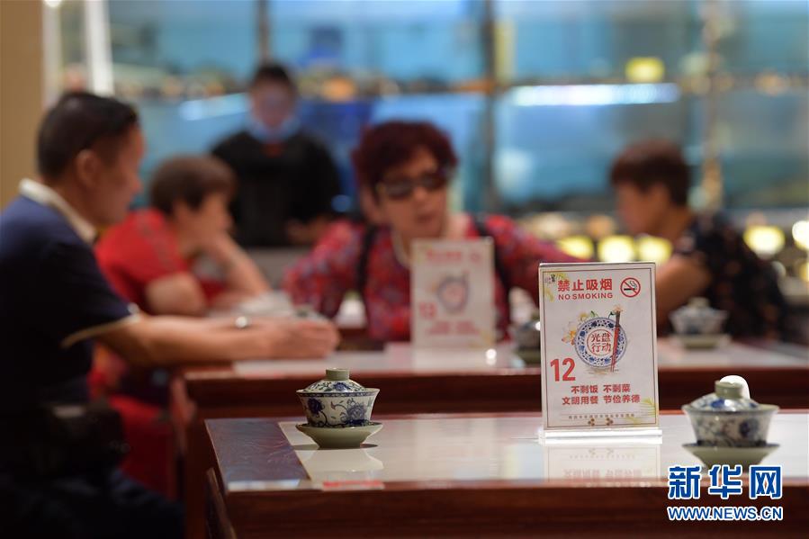 8月15日,顾客在南昌市东湖区一家饭店就餐,餐桌上摆放着“文明用餐”的提示牌。 新华社记者 彭昭之 摄