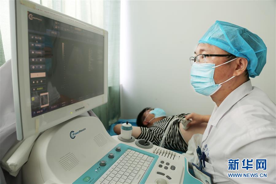 8月19日,江苏省连云港市市立东方医院的一名医务人员为患者做B超检查。 当日是中国医师节,各地医师坚守岗位,在工作中度过自己的节日。 新华社发(王春 摄)