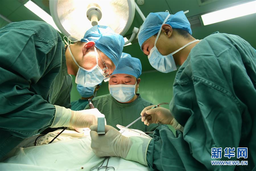 8月19日,在河北省石家庄新乐市医院手术室,医护人员在为患者做手术。 当日是中国医师节,各地医师坚守岗位,在工作中度过自己的节日。 新华社发(贾敏杰 摄)