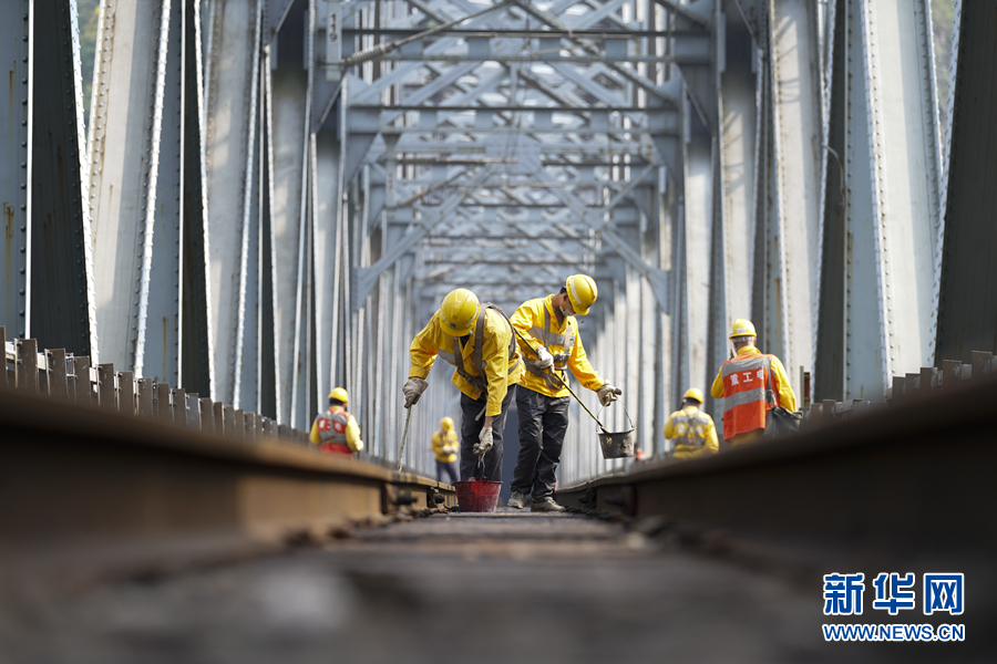 8月21日,在嘉陵江铁路钢梁大桥上,养护工人对枕木进行维护。 位于重庆北碚的嘉陵江铁路钢梁大桥,是襄渝铁路的咽喉要道,是一座全木枕结构的钢梁桥。汛期,中国铁路成都局集团有限公司重庆工电段北碚桥路检查工区的养护工人加大对桥梁的检查、维护力度,保证铁路的安全运行。 新华社发(秦廷富 摄)