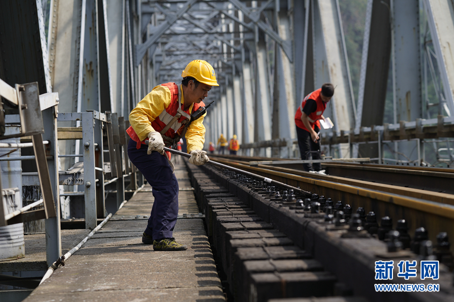 8月21日,在嘉陵江铁路钢梁大桥上,养护工人对铁轨进行检查和养护。 位于重庆北碚的嘉陵江铁路钢梁大桥,是襄渝铁路的咽喉要道,是一座全木枕结构的钢梁桥。汛期,中国铁路成都局集团有限公司重庆工电段北碚桥路检查工区的养护工人加大对桥梁的检查、维护力度,保证铁路的安全运行。 新华社发(秦廷富 摄)