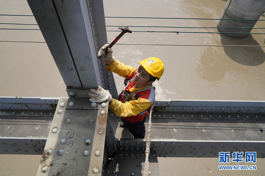 8月21日,在嘉陵江铁路钢梁大桥上,养护工人在钢梁上作业。 位于重庆北碚的嘉陵江铁路钢梁大桥,是襄渝铁路的咽喉要道,是一座全木枕结构的钢梁桥。汛期,中国铁路成都局集团有限公司重庆工电段北碚桥路检查工区的养护工人加大对桥梁的检查、维护力度,保证铁路的安全运行。 新华社发(秦廷富 摄)