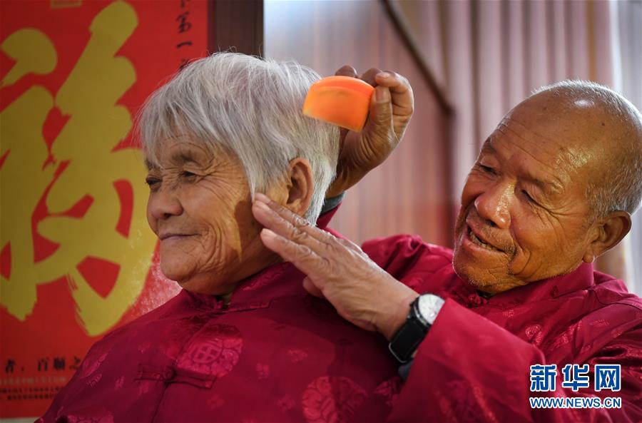 张金水(右)在为妻子郭当存梳头(2019年10月15日摄)。