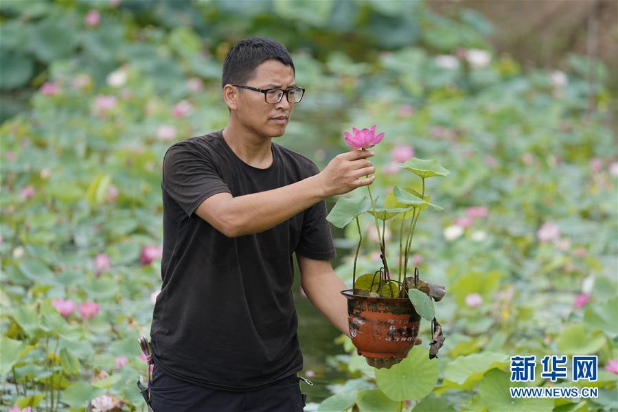 8月24日,在重庆市北碚区静观镇双塘村,尹学颖在查看荷花生长情况。 新华社发(秦廷富 摄)
